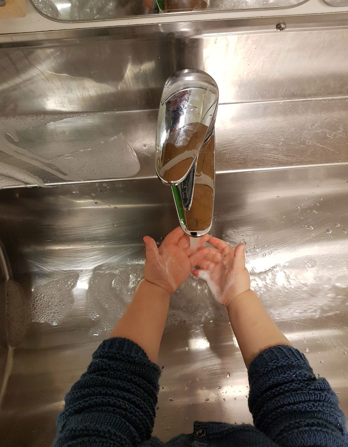 Dere kan hjelpe barna med å skape ny vane som et bra tiltak mot smitte. Nemlig å lære barna at når de kommer i barnehagen så vasker de sine hender. En ren start på dagen.